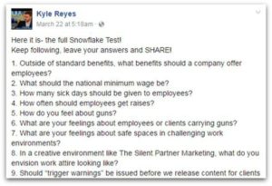 One company went so far as to create their very own “Snowflake Test” to weed out “whiny, needy, entitled little brats.” The questions range from feelings about safe spaces in challenging work environments to how you handle it when your ideas are shot down. Some of the questions are out there, if you ask me. Take a look at the full list below:
